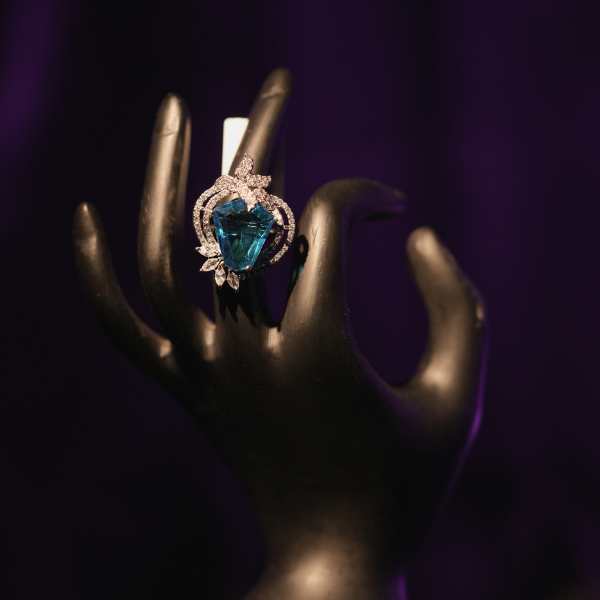 This blue stone cocktail ring is designed to captivate with its deep blue teardrop gemstone and radiant halo setting. Crafted with a premium silver-tone finish, the ring offers a luxurious look while remaining lightweight and comfortable. The intricate stone detailing enhances brilliance from every angle, making it an ideal statement accessory for evening wear, weddings, parties, and festive celebrations. A timeless yet modern design, this ring pairs beautifully with both Western and ethnic outfits, making it a versatile addition to any global jewellery collection.