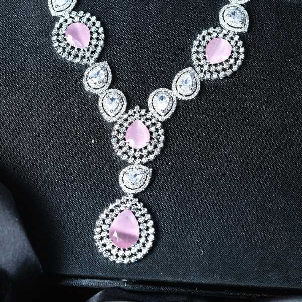 Elevate your elegance with the Blush Radiance Crystal Necklace Set, featuring soft blush pink crystals framed in a dazzling silver-tone finish. A perfect statement jewellery set for weddings, parties, and festive occasions.
