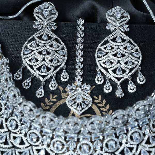 This bridal choker necklace set showcases an ornate layered design crafted with a high-quality silver finish and sparkling crystal accents. The bold choker sits gracefully on the neckline, while the matching statement earrings complete a luxurious bridal look. Designed to complement bridal lehengas, sarees, and gowns, this set offers timeless elegance with modern craftsmanship. Lightweight yet impactful, it ensures comfort during long celebrations. A perfect choice for brides, wedding guests, and festive styling, this jewellery set delivers refined shine, durability, and versatile wear for special occasions.