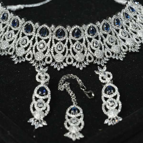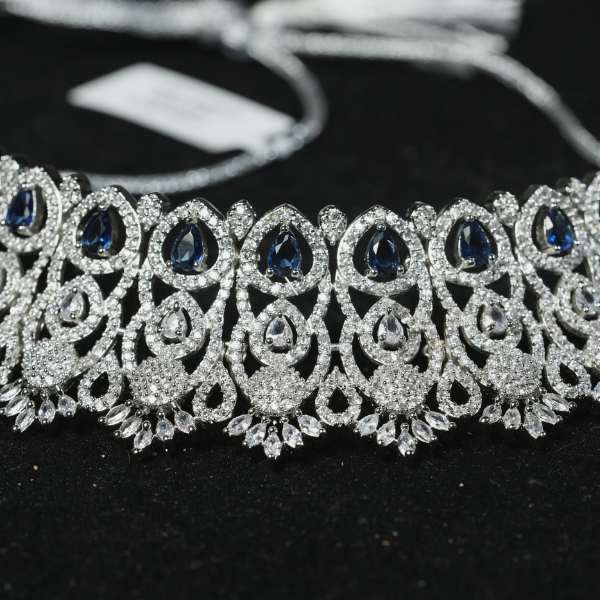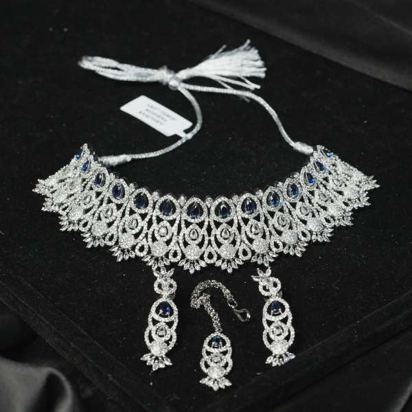This Cubic Zirconia Choker Set blends timeless elegance with contemporary craftsmanship. Featuring precision-cut CZ stones arranged in a rich, symmetrical pattern, the choker offers a radiant diamond-like shine that enhances both traditional and modern outfits. The silver-tone rhodium finish ensures long-lasting brilliance while remaining lightweight and comfortable for extended wear. Paired with matching drop earrings, this set is ideal for weddings, festive occasions, cocktail events, and bridal gifting. A refined choice for women who value sophistication, sparkle, and statement-making style.