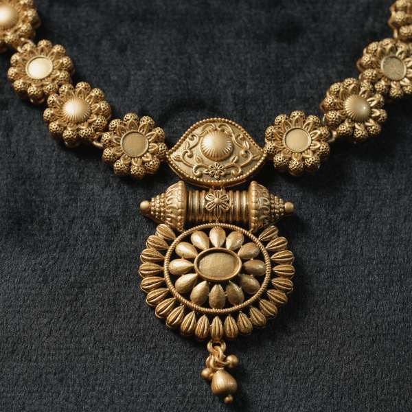 This floral gold necklace is a graceful expression of traditional artistry and feminine elegance. Designed with beautifully sculpted floral motifs, the necklace showcases detailed craftsmanship enhanced by a rich antique gold finish. The central floral pendant adds depth and heritage appeal, while the matching earrings complete the look with perfect balance.