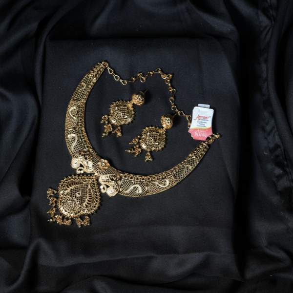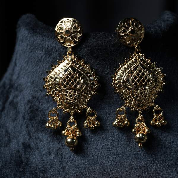 This gold filigree necklace showcases refined craftsmanship inspired by traditional filigree artistry. Designed with intricate openwork patterns and a rich antique gold finish, the necklace creates a graceful and luxurious statement. The matching filigree earrings enhance the overall look, making this set perfect for weddings, cultural ceremonies, festivals, and formal evenings. Lightweight for its detailed design, it offers comfortable wear while maintaining visual richness. A timeless jewellery piece that pairs beautifully with sarees, lehengas, gowns, and fusion outfits, suitable for global tastes.