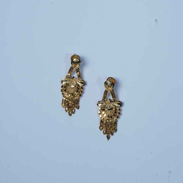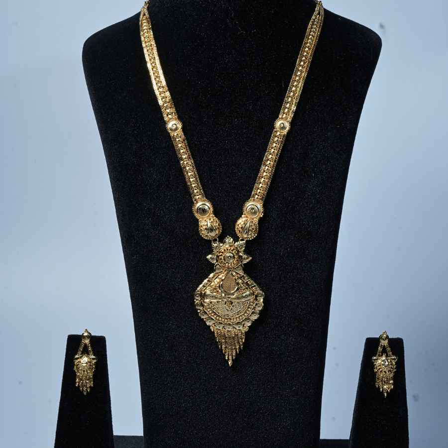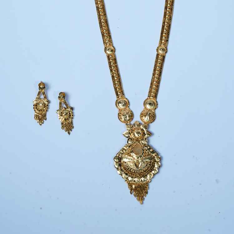 A beautifully crafted gold-plated necklace set featuring intricate traditional motifs, paired with matching earrings—perfect for weddings, festivals, and cultural celebrations.