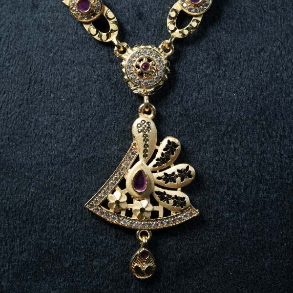 Paired with matching ruby-studded earrings, this necklace set is ideal for festive occasions, family functions, weddings, and elegant daily wear. Its classic design complements sarees, ethnic suits, and fusion outfits, making it a versatile jewellery essential. Designed for women who appreciate understated luxury, this pendant necklace adds warmth, tradition, and sophistication to every look.