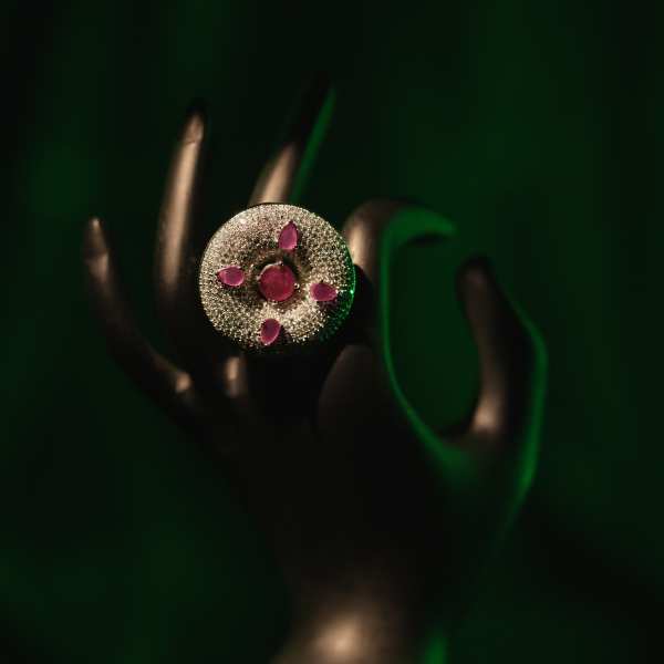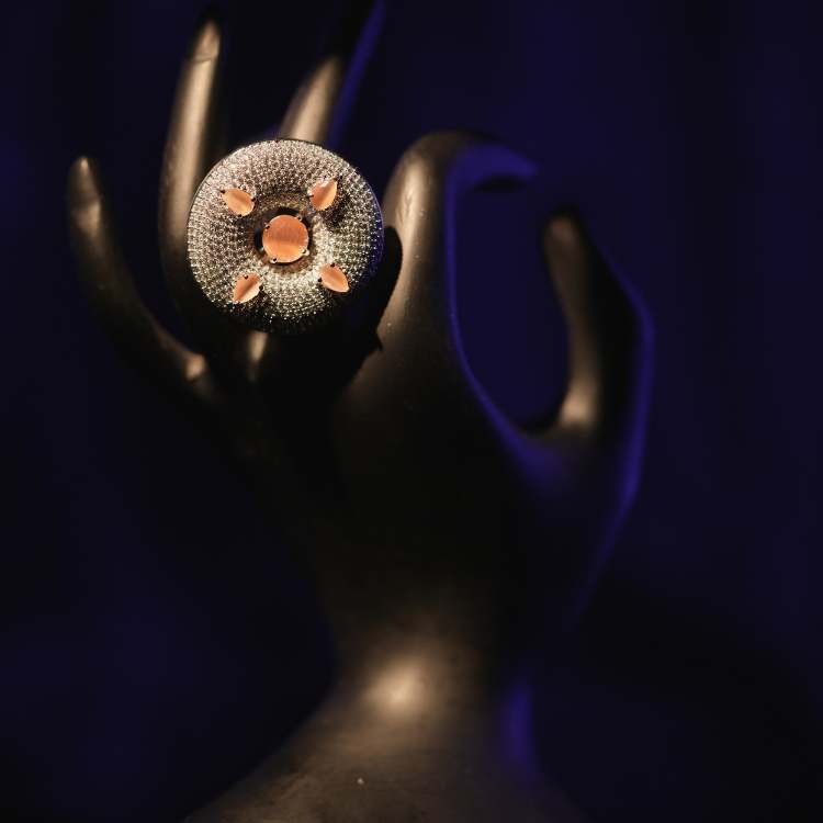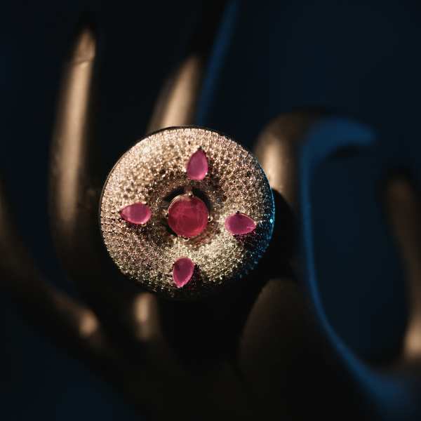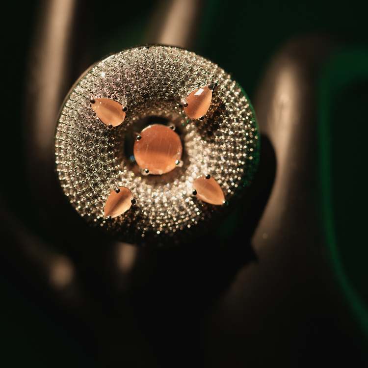 Make a bold yet refined statement with this party wear finger ring, crafted to shine under every light. Designed with a radiant central crystal surrounded by finely set pavé stones, this ring delivers a luxurious look without compromising comfort. Its versatile round halo design pairs beautifully with party outfits, festive wear, and formal evening ensembles. Lightweight and skin-friendly, it is perfect for long hours of wear at weddings, cocktail parties, and celebrations. A must-have accessory for women who love elegant, trend-driven jewellery with international appeal.