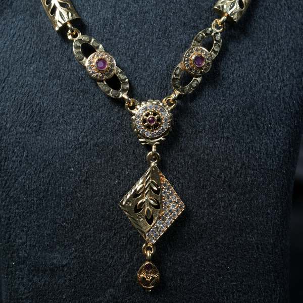 Add timeless sophistication to your jewellery collection with this beautifully crafted bezel setting necklace pendant set. Designed with precision, the pendant showcases a securely mounted bezel setting that highlights its central design while offering durability and a smooth, polished finish. The necklace features intricately detailed gold-finish elements along the chain, creating a graceful and balanced look. Matching earrings complement the pendant, completing the set with understated charm.