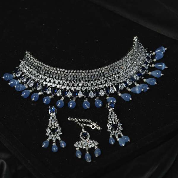 Enhance your ethnic and fusion looks with this premium stone choker necklace set designed for modern Indian women. Crafted with a silver-tone alloy base, the choker showcases shimmering clear stones accented with elegant blue teardrop beads for a refined finish. The matching earrings complement the necklace perfectly, creating a balanced and graceful statement. Lightweight yet eye-catching, this stone choker necklace set is ideal for weddings, festive celebrations, receptions, and special occasions. A versatile accessory that pairs beautifully with sarees, lehengas, and Indo-western outfits while offering long-lasting shine and comfort.