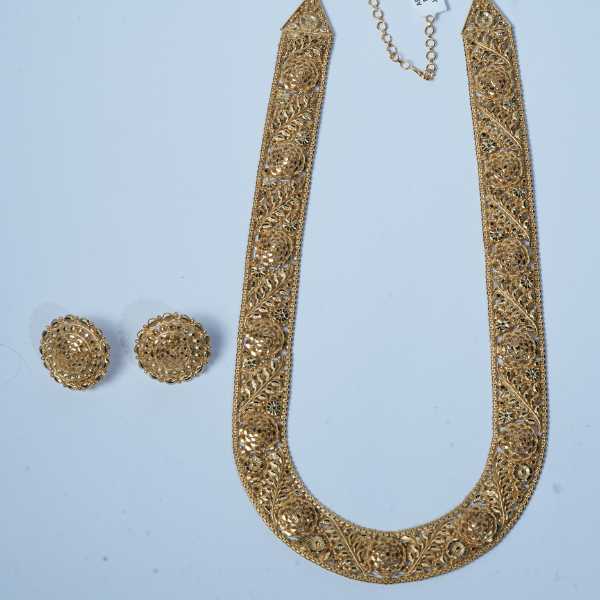 Celebrate timeless tradition with this beautifully designed traditional gold necklace set crafted for women who appreciate classic elegance. The necklace showcases detailed floral and heritage-inspired patterns, finished with a rich gold tone that reflects traditional artistry. The matching earrings add balance and sophistication, completing the look effortlessly.