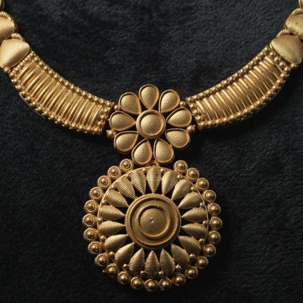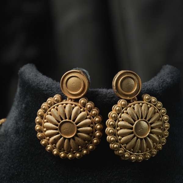 Add timeless charm to your jewellery collection with this elegant antique necklace set, inspired by traditional Indian craftsmanship. The necklace showcases a rich antique gold finish with intricate detailing, highlighted by a bold circular pendant and textured elements that create a regal appearance. The matching earrings mirror the same heritage-inspired design, completing a perfectly coordinated look.